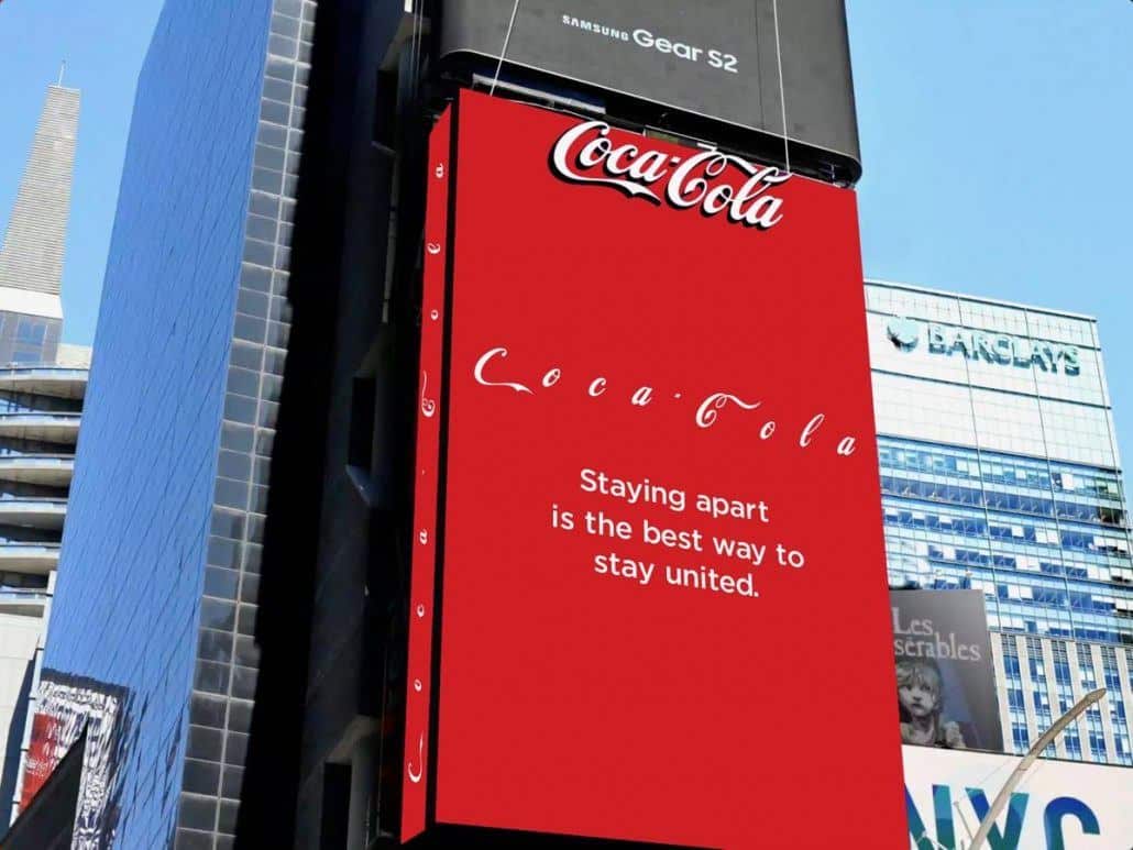 Una nuova campagna Coca-Cola è comparsa a Times Square e sui canali social di Coca-Cola Mexico. Il marchio ha separato ciascuna delle lettere che compongono il suo logo per veicolare il messaggio: “Essere separati è il modo migliore di stare insieme”.
