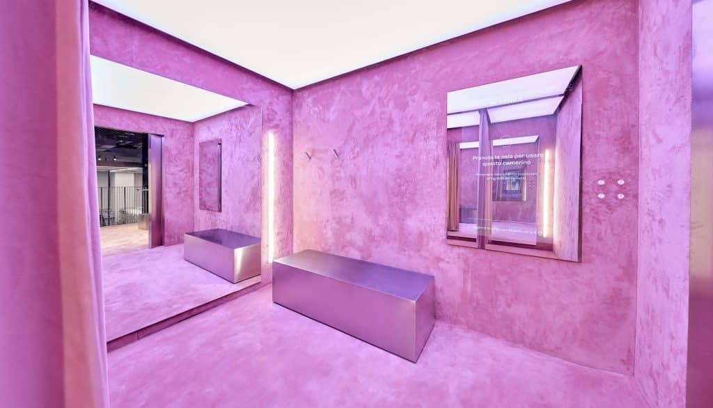 Il brand di moda per giovanissimi, offre un’experience totalizzante da vivere con gli amici. Nel punto vendita di Milano, in Via Vittorio Emanuele, è possibile prenotare una sessione di prove in camerino con 3 amici. Nell’ampio fitting room, tra luci e musica, l’acquisto diventa un momento di divertimento. Le pareti rosa del camerino (progettato da studio OMA) nascondono un sistema che suggerisce i look da provare, e una serie di QR code per provare i molteplici filtri per scattare selfie originali. Laddove la parola d’ordine diventa “postare”.