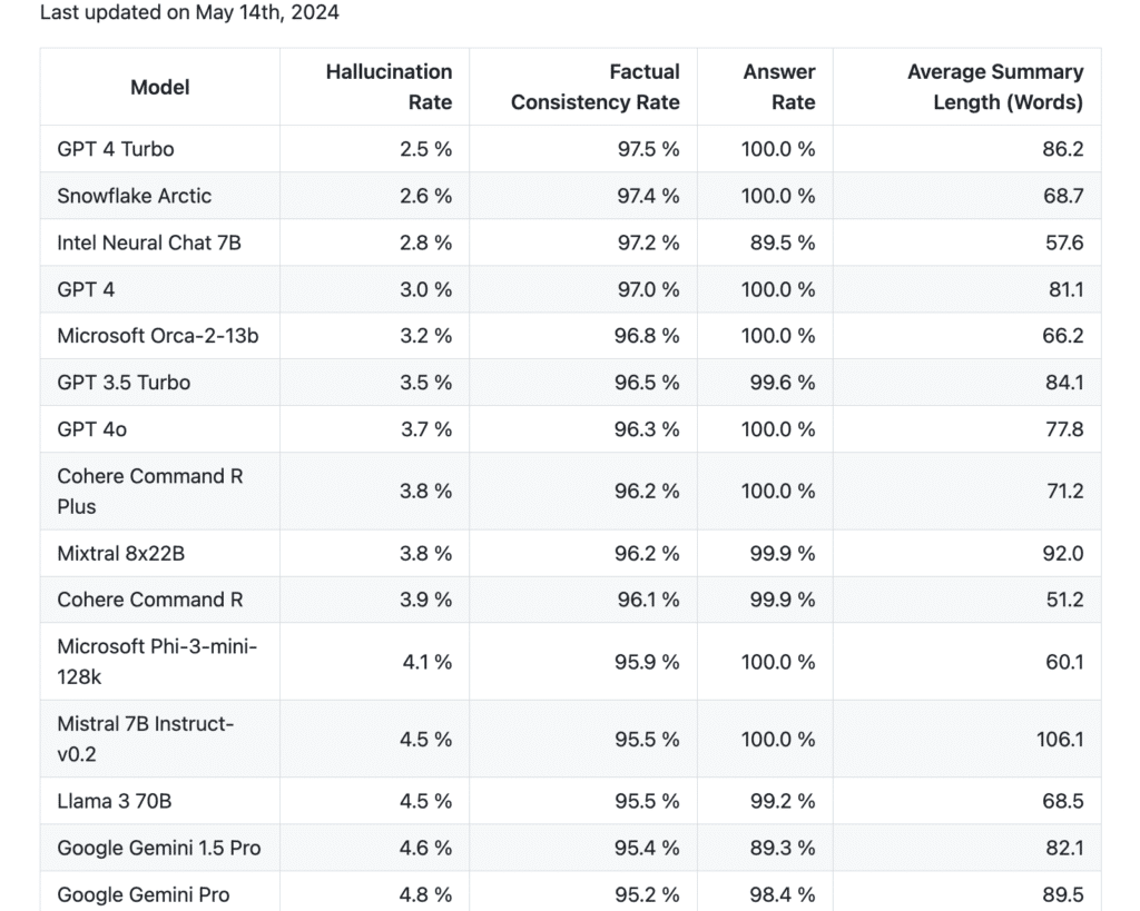 Ecco, secondo la classifica messa a punto da Vectara per valutare quanto spesso capitino questi episodi allucinatori ai LLM (Large Language Models, i modelli AI su cui si basano prodotti come ChatGPT), i risultati aggiornati a maggio 2024 variano da un minimo di 2.5% delle volte a cifre molto più alte come 22.4%.