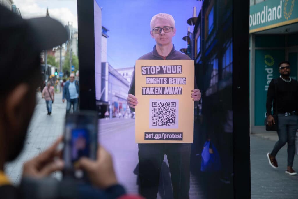La campagna di Greenpeace per il diritto di protestare è una reazione diretta al crescente controllo delle manifestazioni nel Regno Unito. I cartelloni mostrano attivisti reali con cartelli che dichiarano: “I’m protesting in here to avoid arrest out there”.