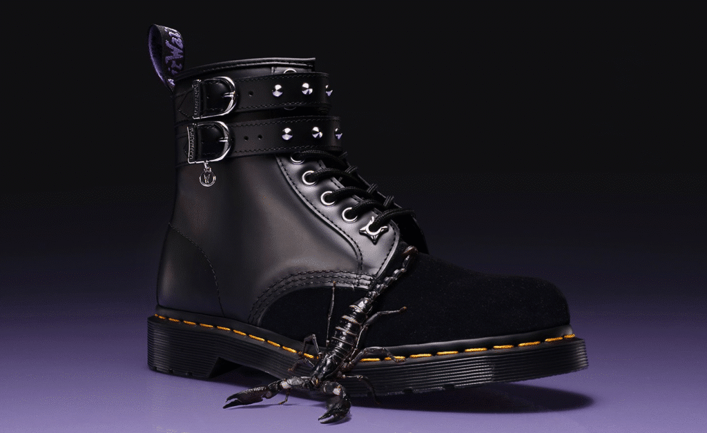 Protagonista è il 1460 Wednesday Boot, in velluto e pelle, arricchito da cinturini borchiati, charm in vetro colorato e dallo slogan “Outcasts Are In” cucito sul retro. Un modello che riflette perfettamente l’immaginario della serie di Tim Burton.