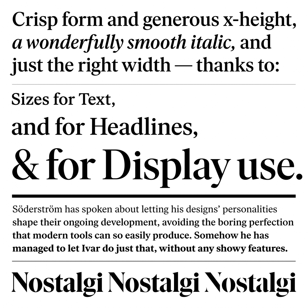 Progettato da Göran Söderström e pubblicato nel 2017, Ivar è fortemente influenzato dalla grazia e dalla robustezza della costruzione di Times ed è disponibile in tre optical sizes. Ogni sottofamiglia è composta da quattro pesi con corsivi corrispondenti per 24 caratteri. I nomi dei formati ottici, Text, Headline e Display, suggeriscono come dovrebbero essere applicati.