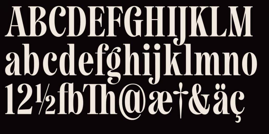 I suoi 1.270 caratteri contengono molte lettere decorative e variazioni di swash per le lettere iniziali, mediali e finali, il che lo rende un’ottima scelta anche per la progettazione di loghi.