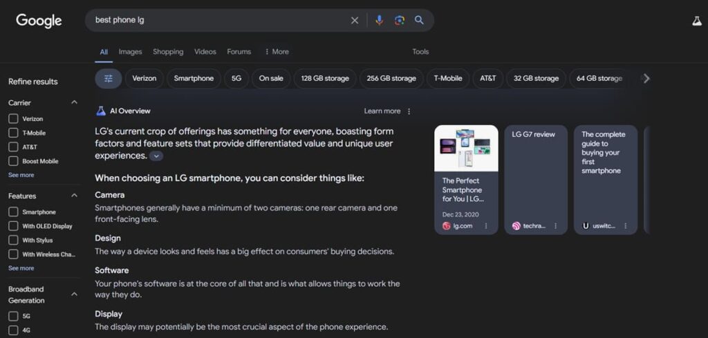Secondo uno studio di Semrush, inoltre, le query che fanno attivare il box SGE di Google sono quelle in cui si pone una domanda basata sui fatti (Qual è la capitale dell’Italia?), per le quali fornirà una breve risposta; quelle di definizione (Qual è la definizione di robot?), in cui fornirà anche alcune esempi di utilizzo; le query “how to” (Come fare una torta), di confronto (Samsung VS LG) e Shopping (migliori cellulari sotto i 200 dollari).