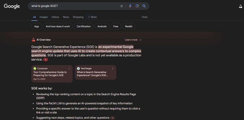 SGE rappresenta un primo passo nella trasformazione dell’esperienza di ricerca con l’intelligenza artificiale generativa. Quando utilizzano SGE, le persone noteranno la pagina dei risultati di ricerca con risultati web familiari, organizzati in un modo nuovo per aiutarli a ottenere di più da una singola ricerca – Google