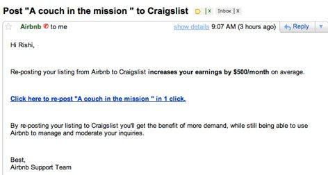 - Copiare il proprio annuncio su Craiglist. Successivamente Airbnb ha iniziato ad avere un problema nella domanda della loro piattaforma. Come hanno risolto il problema? Hanno creato un hack che permetteva ad ogni annuncio su Airbnb di essere replicato su Craiglist, una piattaforma di annunci molto in voga negli Stati Uniti. Risultato? Ogni ospitante ha moltiplicato il numero di persone che vedeva il proprio annuncio ed Airbnb ha avuto un grandissimo incremento di pubblicità in modo totalmente gratuito.