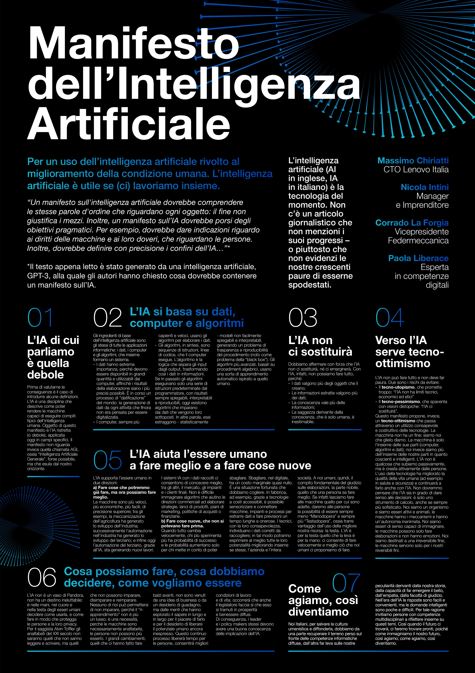 Perché un Manifesto italiano dell’AI? «L’Intelligenza Artificiale, come ogni altra tecnologia, può portare aiuto o nocumento all’Umanità, essere strumento di bene e di male, e come tale porre inevitabilmente la necessità di una riflessione etica. Il Manifesto propone sette punti per fare da guida in questo nuovo territorio. Il fine è la costruzione di uno strumento utile e che migliori la vita, fortemente supportato dalla consapevolezza che al centro di ogni azione umana, di ogni invenzione, c’è l’Uomo e il suo progresso. L’Italia, culla dell’Umanesimo, può portare un grande contributo etico e umano». Attraverso quali lenti dobbiamo guardare l’Intelligenza Artificiale? Cosa ci dice il Manifesto AI? «Oggi il dibattito vede posizioni molto diverse tra chi si affida alla tecnologia quasi fosse una bacchetta magica (i tecno-utopisti), e chi lascia presagire scenari distopici (i tecno-pessimisti). Noi riteniamo invece che l’atteggiamento giusto sia il tecno-ottimismo consapevole. Conoscendo infatti i rischi cui lo strumento ci espone, protremo gestirli o prevenirne gli effetti negativi».