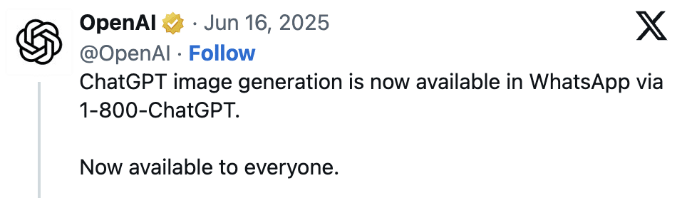 • Se non colleghi il tuo numero WhatsApp a un account OpenAI, hai un limite di 1 immagine al giorno. Per ottener più immagini, collega il tuo numero al tuo account ChatGPT.