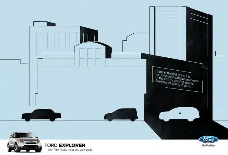 L’agenzia Saatchi e Saatchi ha creato per Ford una campagna pubblicitaria nella quale si chiedeva all’osservatore di fissare un puntino nero (quello sulla terza macchina) per 30 secondi, in modo da visualizzarla poi parcheggiata tra le due precedenti, come se si fosse mossa