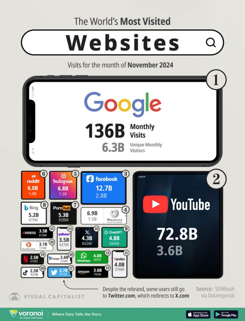 L’infografica pubblicata da Visual Capitalist mostra i siti web più visitati al mondo a novembre 2024. Nonostante il crescente utilizzo delle app, analizzare il traffico da browser desktop e mobile fornisce spunti preziosi su come gli utenti scoprono e interagiscono con i contenuti. I dati Visual Capitalist offrono una panoramica chiara dei comportamenti digitali più attuali.