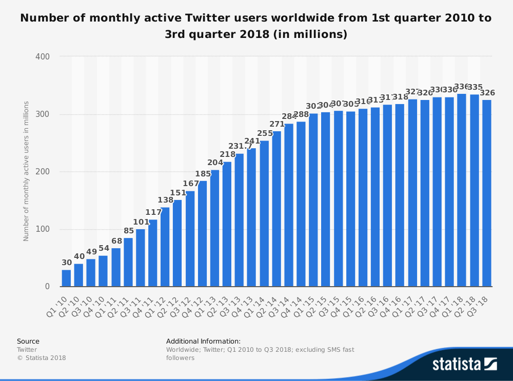 Una delle questioni su cui si sta dibattendo da un po’ di tempo a questa parte è se Facebook stia uccidendo Twitter o se Twitter si stia rovinando con le sue stesse mani. Se è vero infatti che Instagram, con l’introduzione delle Stories, ha dato un duro colpo alle aspirazioni di affermazione extra-adolescenti di Snapchat, non si può dire la stessa cosa per Twitter, che non si è visto derubare della sua caratteristica distintiva: offrire la possibilità all’utente di esprimersi sinteticamente sulla questione “Che c’è di nuovo?”. Poco importa se i caratteri disponibili sono raddoppiati e le timeline si sono via via riempite di immagini, link, GIF e video: il numero di Monthly Active Users dal 2015 a oggi è cresciuto molto più lentamente rispetto a tutti gli altri grandi competitor social. E nel terzo trimestre 2018 Twitter sembra aver perso 9 milioni di utenti attivi!