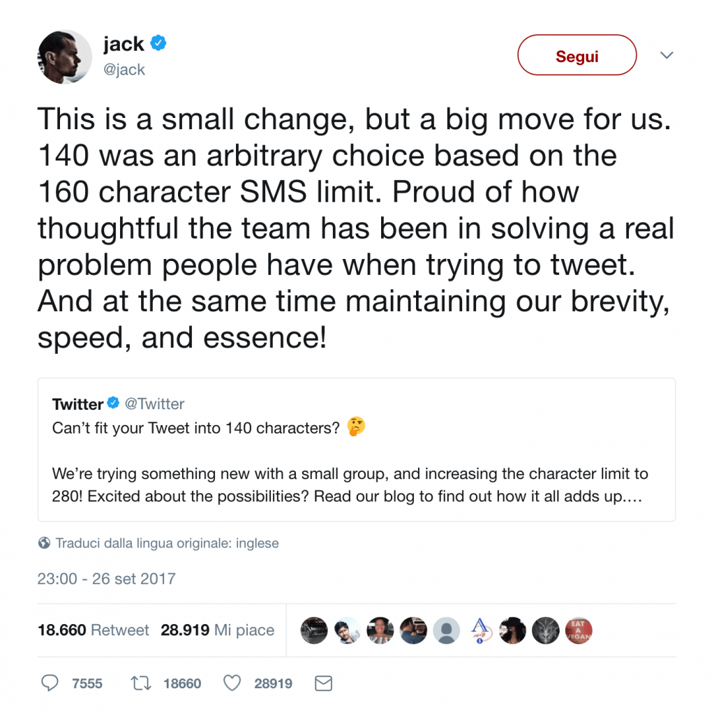Negli ultimi due anni Twitter ha mancato gli obiettivi di crescita che il mercato e gli investitori si aspettavano. La situazione in borsa non sembra essere problematica in questo periodo, anzi, ma di certo nei prossimi mesi ci si aspetta un forte segnale sopratutto in termini di visione strategica. I Social Media si sono evoluti negli ultimi anni in maniera progressiva e abbastanza uniforme. Ma se l’affermazione di contenuti visual e video non hanno risparmiato Twitter, il testo in formato sintetico rimane alla base dell’esperienza che offre: dai contenuti seri e informativi alle sagaci battute sugli argomenti del momento, la prerogativa di Twitter è che i suoi utenti padroneggino sia la costruzione dei testi diretti e originali sia la capacità di sintesi. Motivo per cui per sua natura Twitter non è mai stato per tutti. L’ascesa dei contenuti visuali sta disabituando molte persone alla scrittura, a favore di altre forme di espressione e a sfavore di tutti gli spazi in cui, per essere popolari, bisogna ancora battere forte sulla tastiera. Per ovviare al “limite” della lunghezza dei messaggi da produrre, Jack Dorsey e soci nel settembre 2017 hanno tirato la coda all’uccellino per allungare i tweet, permettendo alle persone di utilizzare fino a 280 caratteri. Mossa potenzialmente astuta per attirare nuovi utenti, ma infelice nel consolidare la base utenti esistente. All’annuncio della novità dei 280 caratteri moltissime persone hanno sottolineato che, invece di raddoppiare le possibilità espressive, per la community era più importante offrire la possibilità di editare un tweet dopo esser stato pubblicato. Opinione di pochi tw-influencer? L’impressione è che l’appeal di Twitter sia rimasto invariato per le persone che non lo avevano preso in considerazione, e che probabilmente rimarranno legati a piattaforme con contenuti più semplici da creare e fruire, mentre le community legate al microblogging abbiano mal digerito la novità e in particolare lo spirito con cui è stata proposta. Settembre 2017: da 140 si passa a 280 caratteri.
