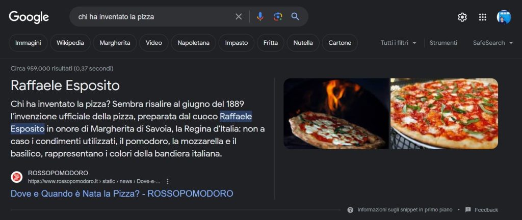 È un esempio la “Posizione Zero”, o Featured Snippet, un risultato evidenziato in primo piano in SERP, al di sopra di tutti gli altri, generalmente delimitato da una cornice dedicata. Assicurandosi lo snippet in primo piano di Google potrai aumentare la possibilità di ricevere clic dagli utenti e garantire un’ampia visibilità al tuo sito web.